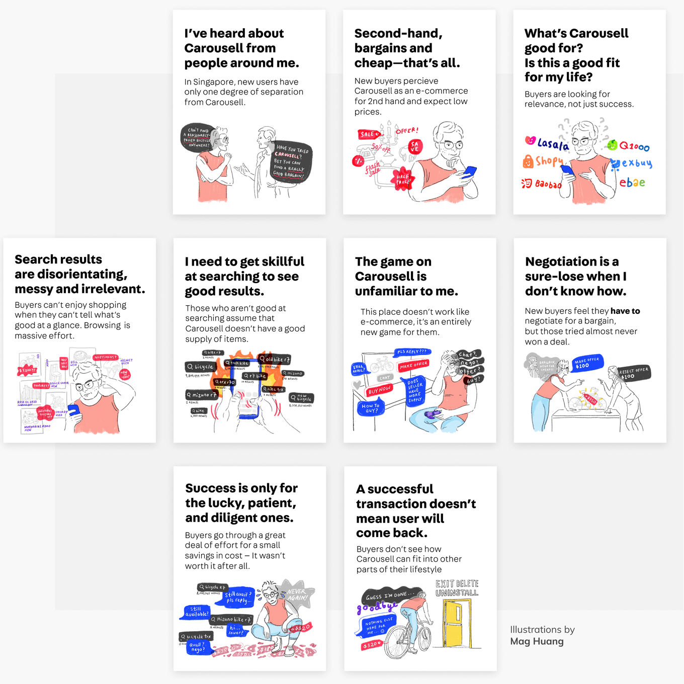 We decided to go deep and studied 70 new buyers. After a series of user interviews, reviews of interaction history, low-fi experiments and a follow up 3 months later, some patterns started to emerge. Below is a compilation of them: