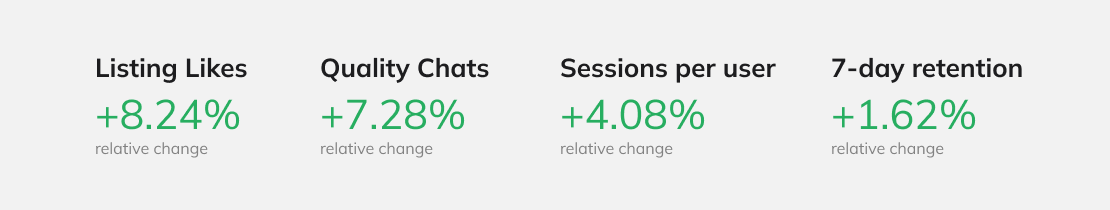 The first iteration improved listing likes and time spent but lacked statistical significance in 7-day retention. Post-launch research identified the need for a simpler entry point. Next step efforts focused on refining the ML algorithm based on concept testing insights and redesign the home screen section.